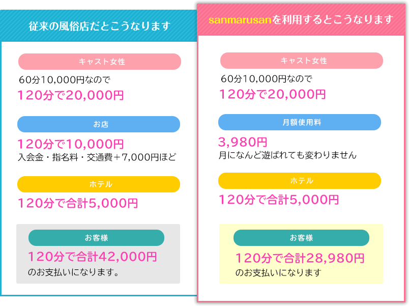 sanmarusanでは、同じ時間遊んだ場合でも、キャスト女性のお給料が変わらず、お客様はお安くご利用できるお得なマッチングサイトとなっております。